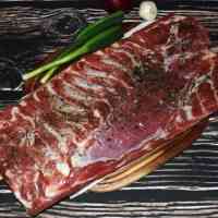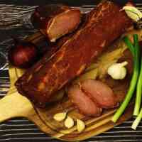 Cold Smoked, Premium Quality. Composition: Pork Ham with fat (91%), salt, spices. The energy value, 100 g: 1342kJ/232 kcal. Storing conditions: 0 +15 °C.