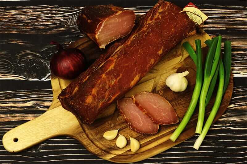 Cold smoked, Premium Quality. The tenderloin without bone and skin, dry -salted, smoked alder smoke. (Nugarinė be kaulo ir odos, sausai sūdyta, rūkinta alksnio dūmu.) Storing conditions: 0 +15 °C