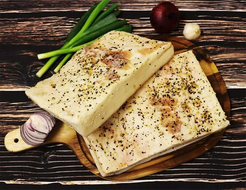 Dry Salted. Pork fat without bone with skin, dry-salted. ( Lašiniai be kaulo su oda, sausai sūdyti.) Storing conditions: 0 +15 °C.