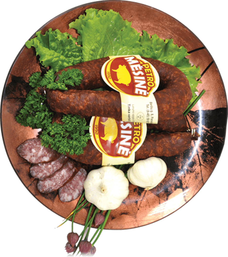 Cold Smoked. Composition: pork (87 %), pork lard (9 %), salt, spices. There are allergens (whey powder). The energy value, 100 g: 1093 kJ/262 kcal. Storing conditions: 0 +15 °C.